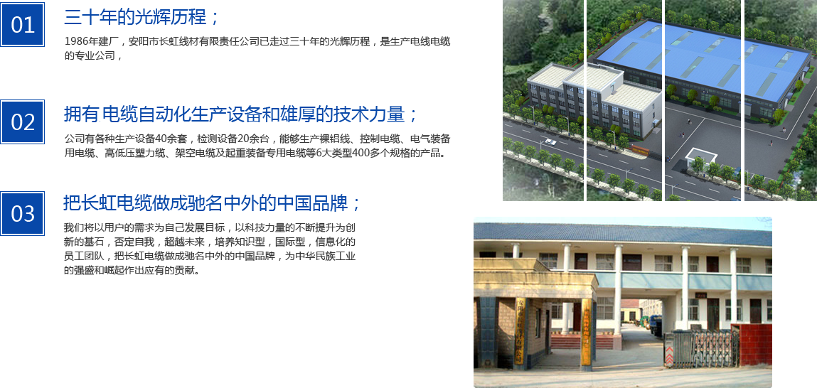 安陽(yáng)市長(zhǎng)虹線(xiàn)材有限責(zé)任公司,是生產(chǎn)電線(xiàn)電纜的**公司。公司坐落在甲骨文的出土地--中國(guó)七大古都之一的安陽(yáng)市轄區(qū),比鄰舉世聞名的青銅冶煉遺址,三千年鑄造文明一脈傳承。1986年建廠(chǎng),長(zhǎng)虹線(xiàn)材已走過(guò)三十年的光輝歷程。公司擁有**的電纜自動(dòng)化生產(chǎn)設(shè)備和雄厚的技術(shù)力量,先后獲得了工業(yè)產(chǎn)品生產(chǎn)許可證、“CCC”國(guó)家強(qiáng)制性產(chǎn)品認(rèn)證證書(shū)、通過(guò)ISO9001:2008質(zhì)量管理體系認(rèn)證,是河南省質(zhì)量監(jiān)督檢驗(yàn)院產(chǎn)品質(zhì)量承檢單位,是資信評(píng)估“AAA”級(jí)信用單位。